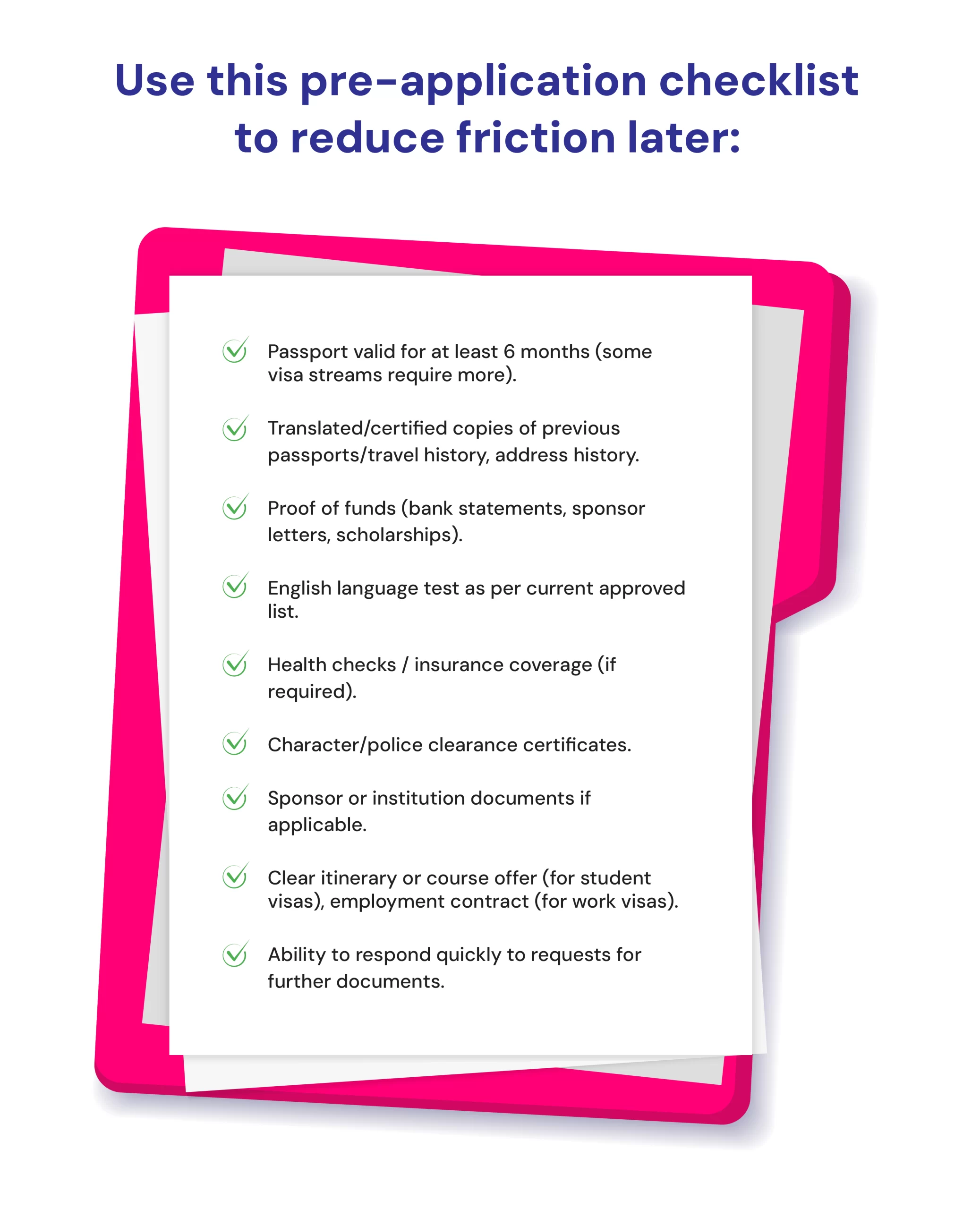Health / Character / Security checks | These external verifications can take weeks or months, especially for certain nationalities or travel histories. | Disclose all required information at outset; schedule health exams early; ensure police/character clearances are ready or in progress. |