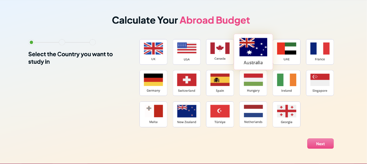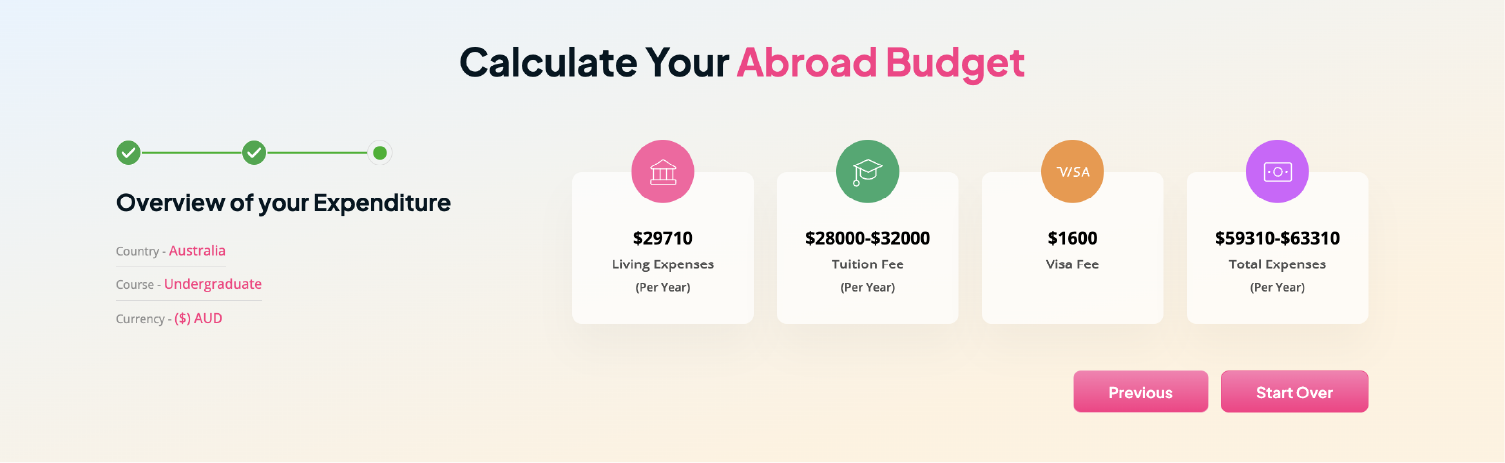 Imagine instead of having some random numbers popping on your screen, you get the correct amount about how much it will cost you to study in Australia. It seems like a dream, right? Well, MetaApply IE has solved this problem for you. With our exclusive Study Abroad Budget Calculator, all you have to do is select your preferred study abroad nation, the program you want to study abroad, and boom! There comes the final and exact count of how much it will cost you to study abroad in that particular country. For your easy understanding, here is a step-by-step process of calculating how much it will cost you to study abroad in Australia.