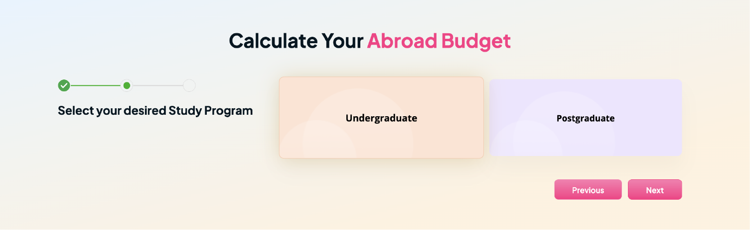 Select whether you want to calculate the budget for an “Undergraduate” or “Postgraduate” program and then click next.