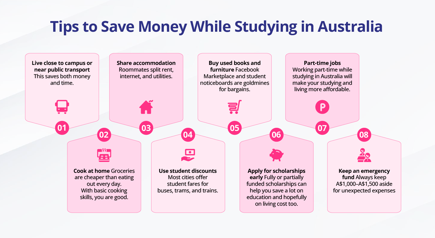 A$5,000 a month is more than sufficient for most students. Average monthly expenses range from A$1,500-2,300, covering rent, food, and travel. With A$5,000, you can live comfortably, travel occasionally, and still save money.