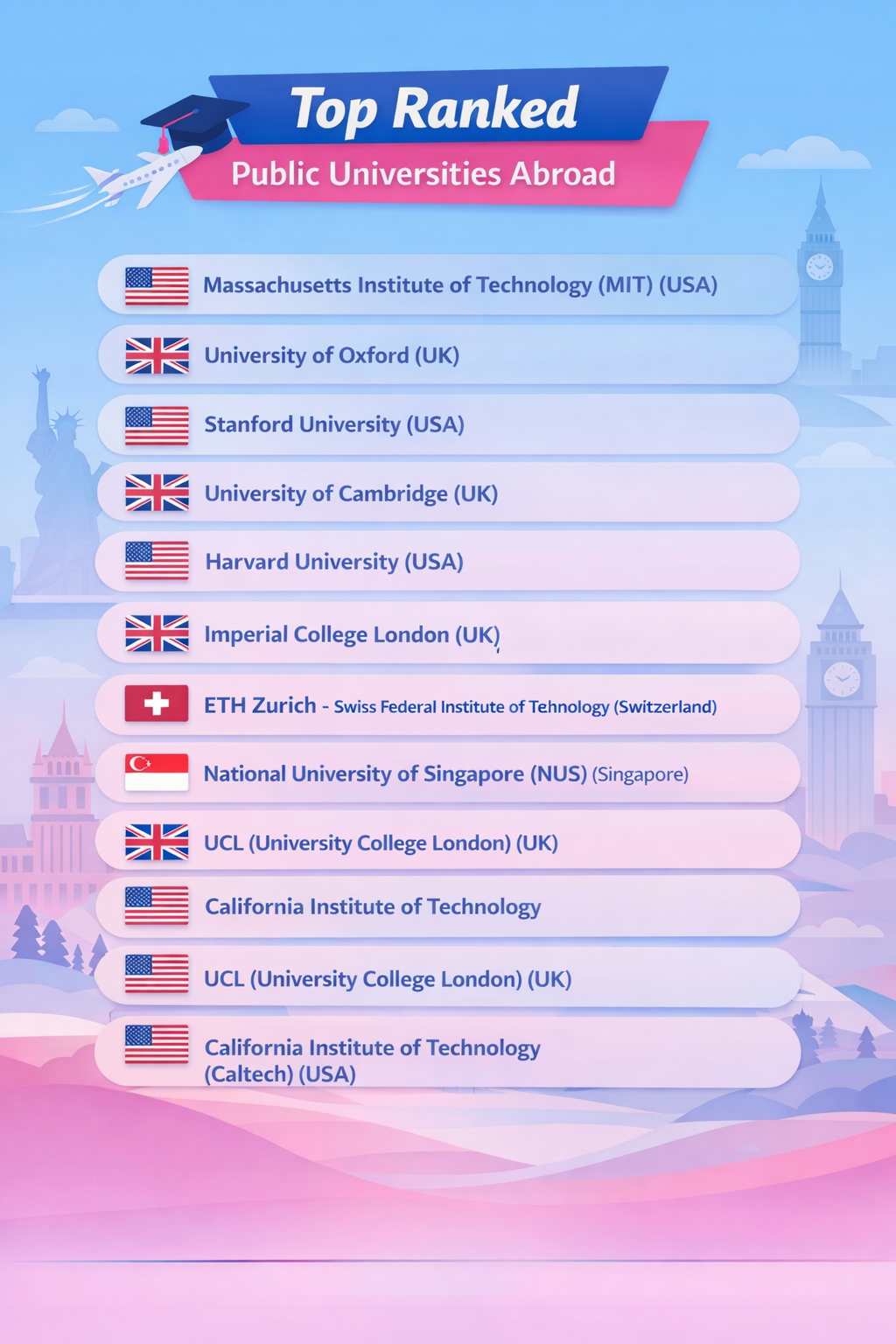 Top ranked public universities abroad are globally respected institutions funded largely by governments and known for accessible excellence. You may find many of them across countries like the USA, Germany, Canada, Australia, and parts of Europe. Here’s a list of top ranked public universities to study abroad.