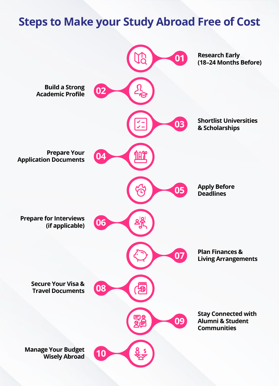 Now that you have seen what are the ways through which you can study abroad for free in 2026. It is now time to see how you can secure one of those chances. Here’s a step-by-step process for the same.