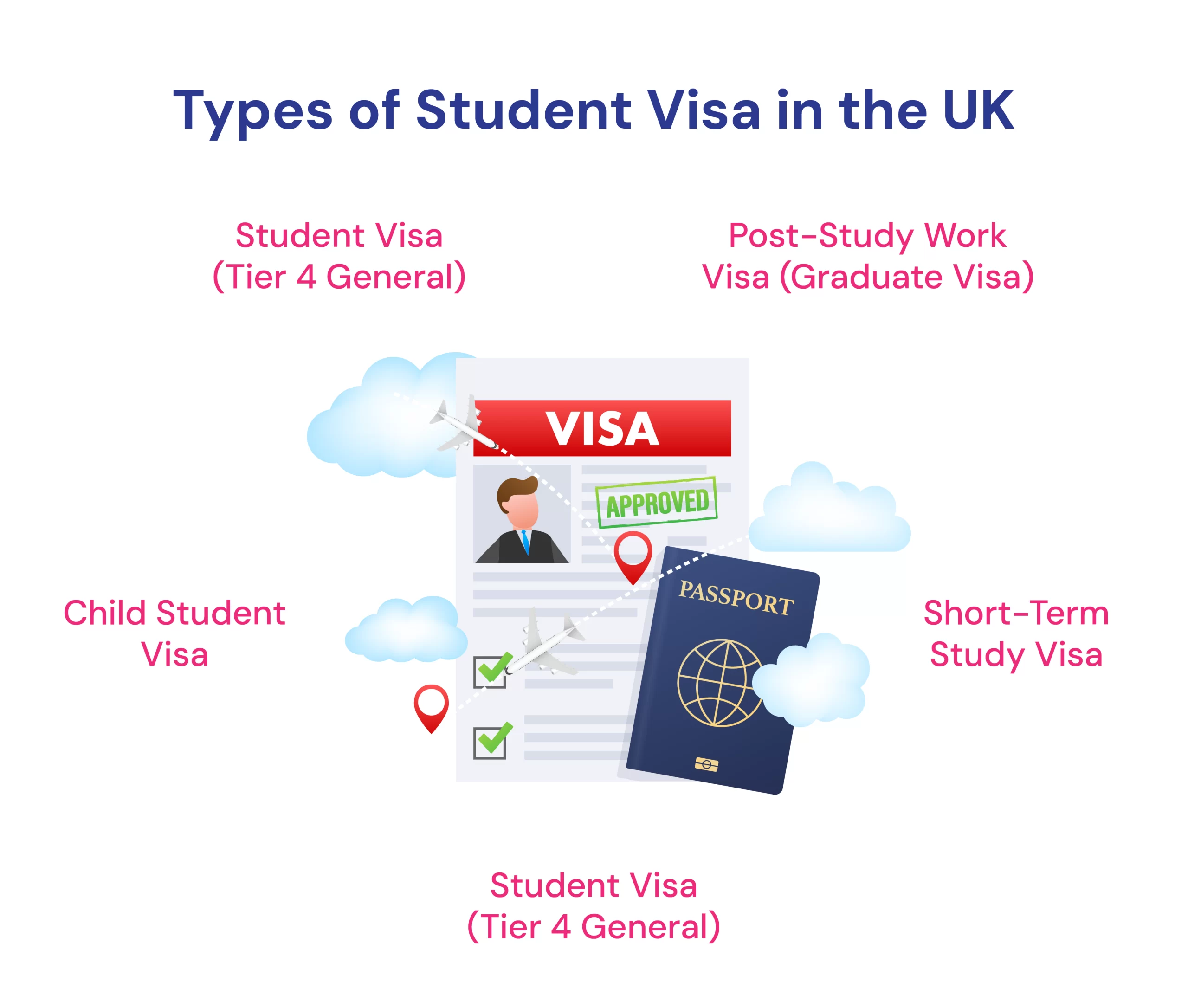 The UK offers Student Visa, Short-Term Study Visa, Child Student Visa, Graduate Visa, and Health and Care Worker Visa for eligible students.