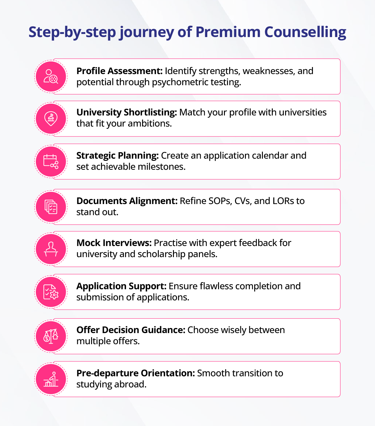 Premium Counselling isn’t just another service; it’s your personalised roadmap to the world’s finest universities. Imagine having a mentor who doesn’t just advise but crafts every detail of your study abroad journey, right from shortlisting the right universities, preparing standout applications, securing scholarships, and even preparing you for interviews. That’s what Premium Counselling does, it transforms an overwhelming process into a confident, strategic pursuit of your dream education.