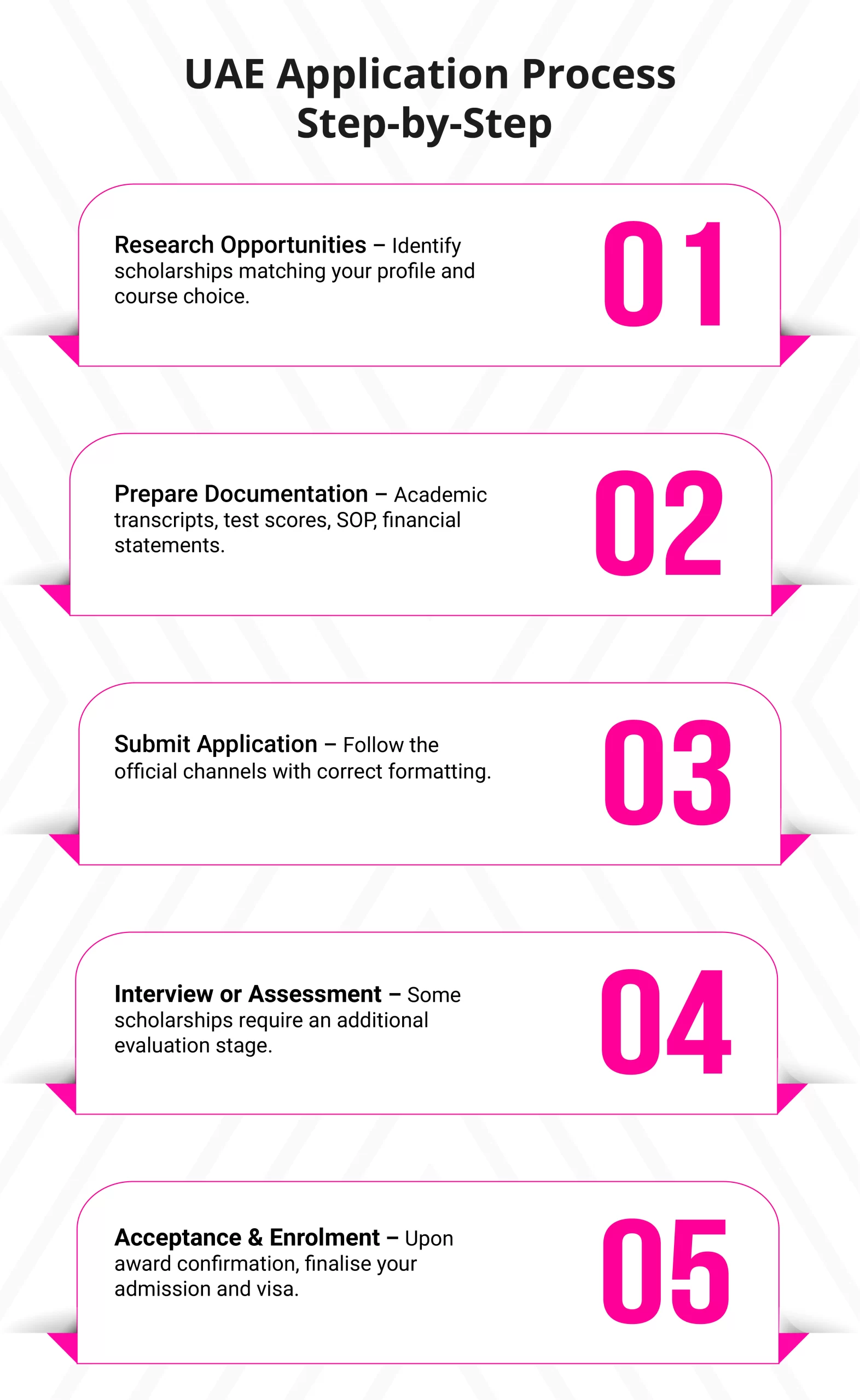 To apply for a scholarship to study in UAE, start by researching programmes that match your academic profile and course choice. Prepare the required documents such as transcripts, language proficiency scores, a strong Statement of Purpose (SOP), and recommendation letters. Submit your application before the deadline and follow up if interviews or assessments are required.