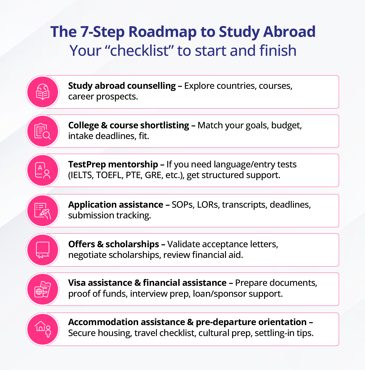 | Who will help me through the full process (counselling, application, visa, accommodation)? | Trying to navigate alone means delays, errors. You want support. | Identify a study-abroad partner who offers end-to-end services (counselling, TestPrep, visa, accommodation). |