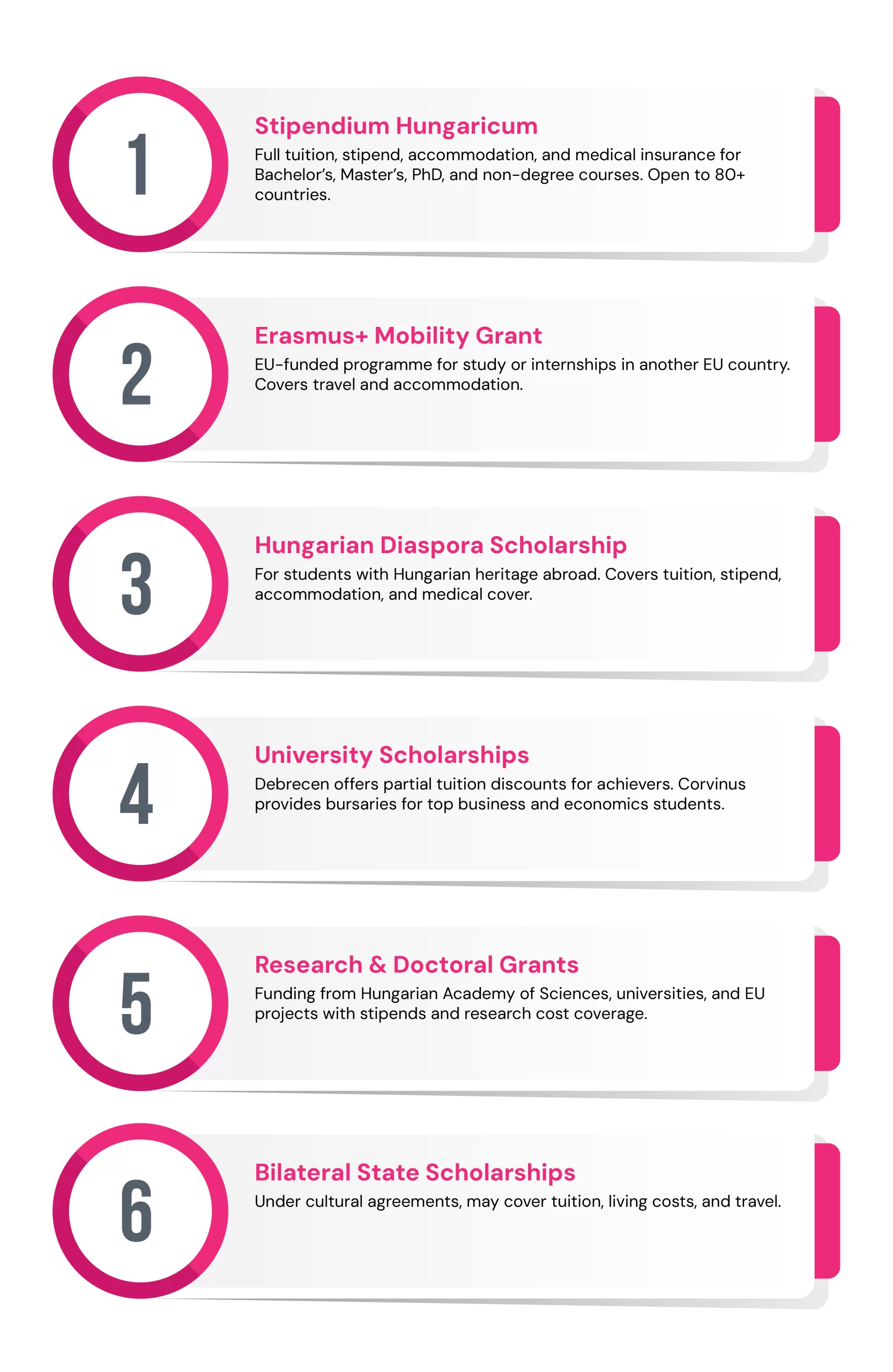 The Stipendium Hungaricum scholarship covers full tuition, includes a monthly stipend, accommodation support, and health insurance, making studying in Hungary nearly tuition-free.