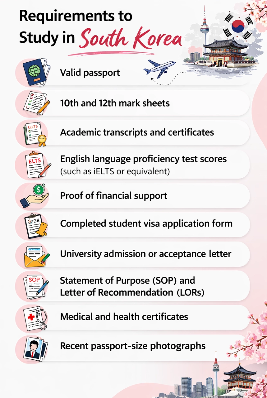 Now, as you begin planning your journey to study in South Korea, it is important to understand the basic admission and visa requirements you must fulfil. To help you prepare better, here are some of the common documents and requirements needed to pursue your study abroad journey in South Korea.
