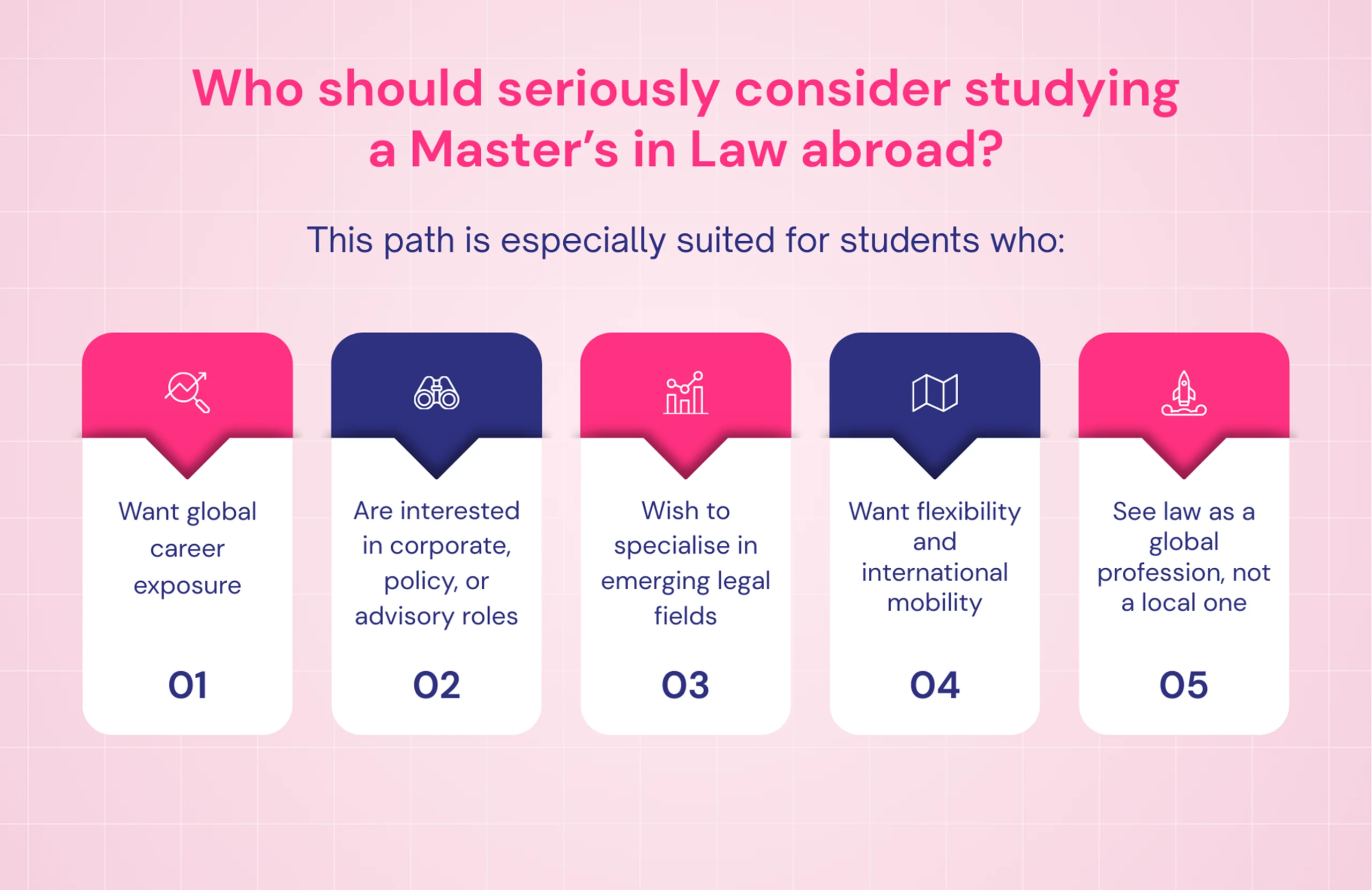 A Master’s in Law abroad is ideal for students who want international exposure, career mobility, specialised legal knowledge, and a future-ready legal career beyond domestic practice.