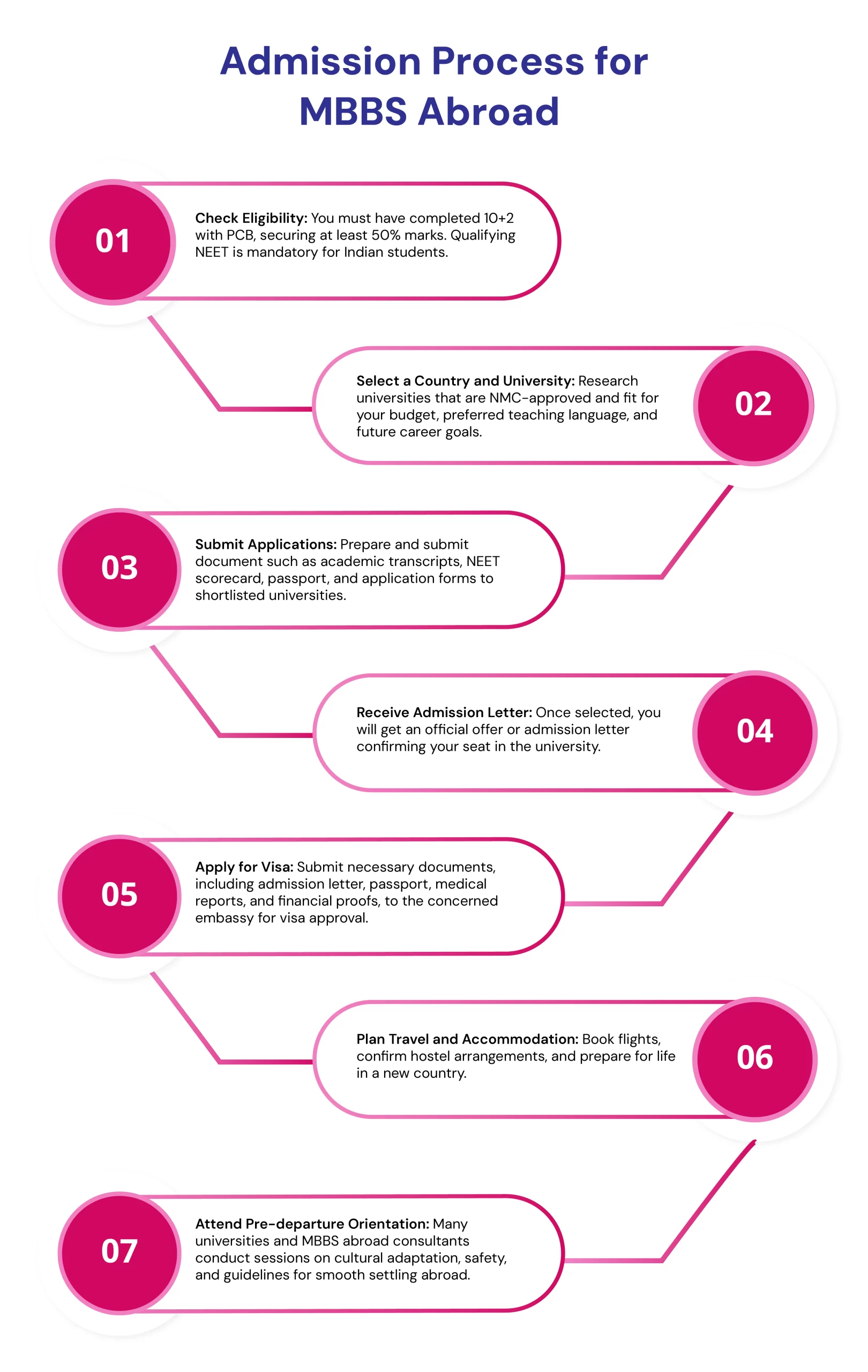 MBBS abroad consultants aim to offer counselling, NMC-approved university shortlisting, admission application support, visa assistance, travel, accommodation, and post-arrival support. In short, an MBBS abroad consultant aims to handle end-to-end process, ensuring you get a chance to live your dream of a doctor.