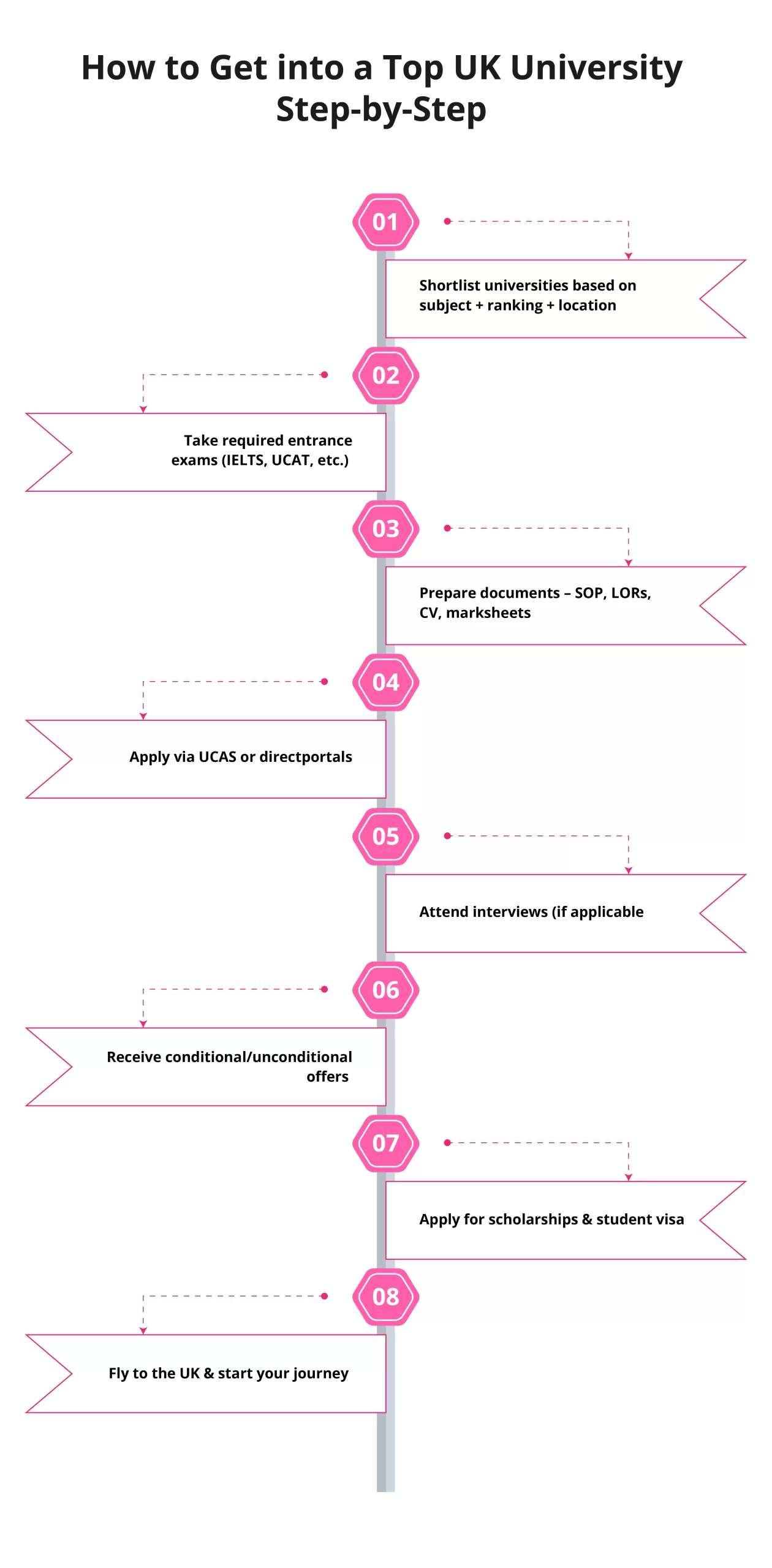 To study at leading UK universities, international students typically need strong academic scores, proof of English proficiency (like IELTS, PTE, or TOEFL), a personal statement, letters of recommendation, and in some cases, admission test scores (such as UCAT or LNAT). Requirements vary by course and institution.