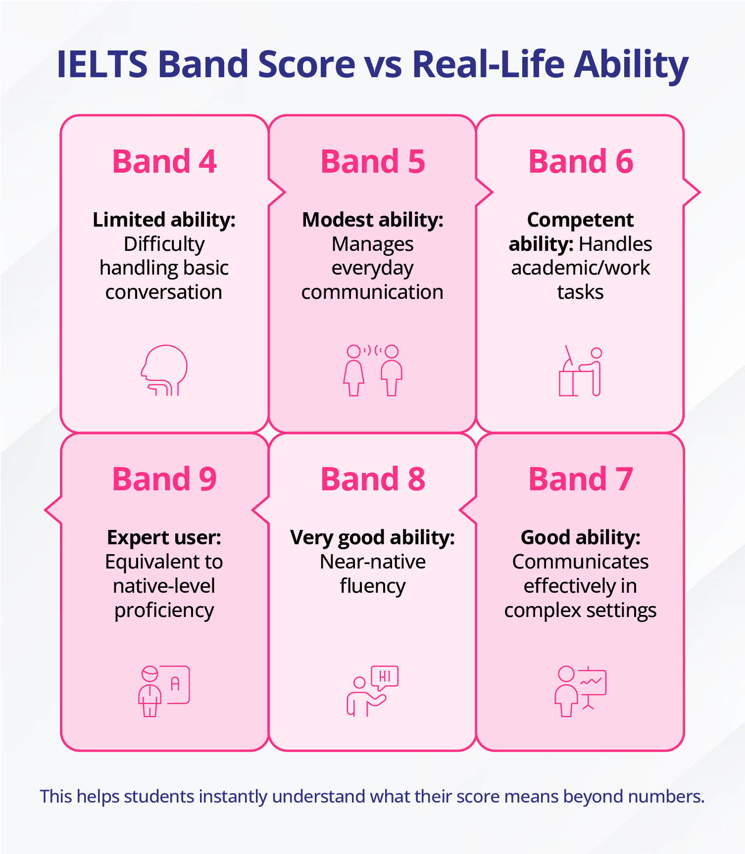 IELTS checks academic readiness, your ability to understand lectures, communicate ideas, and participate in coursework.